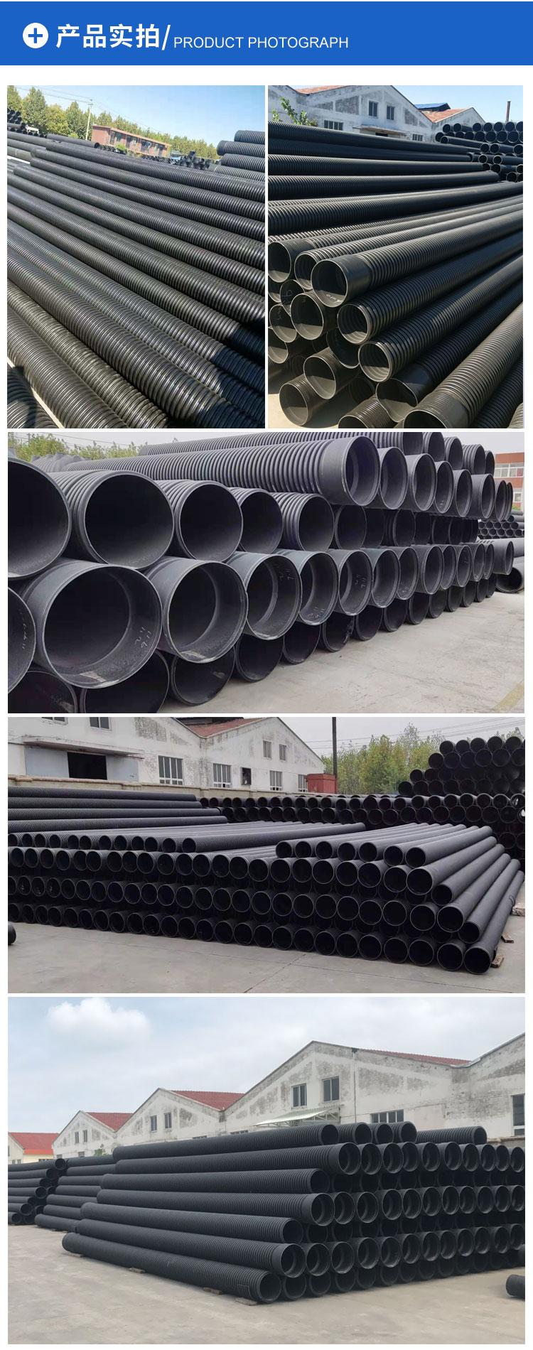 HDPE雙壁波紋管是以HDPE為主要原材料的復合型管材。廣泛應用于市政、小區、工業雨污水排放、電力通信護套、農田灌溉等。